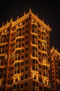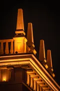 Концепция подсветки строится на уважении к стилю сталинского неоклассицизма, которым вдохновлён фасад.