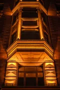Световые линии выделяют рельефные карнизы, колонны и эркеры, подчёркивая строгость форм и ритм фасада.
